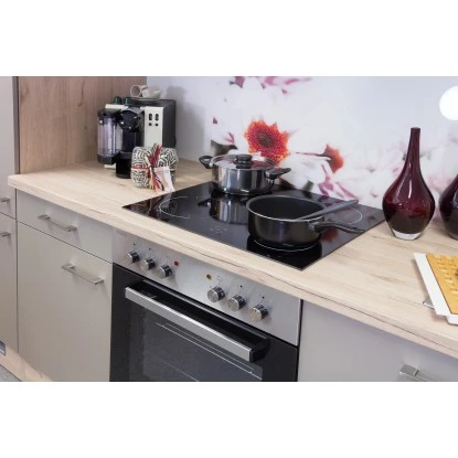 und elegantem 4-Zonen-Glaskeramikkochfeld lassen sich schnell köstliche Mahlzeiten zubereiten. Diese Küchenzeile berücksichtigt die Möglichkeit, einen bereits vorhandenen Stand-Kühlschrank beizustellen.