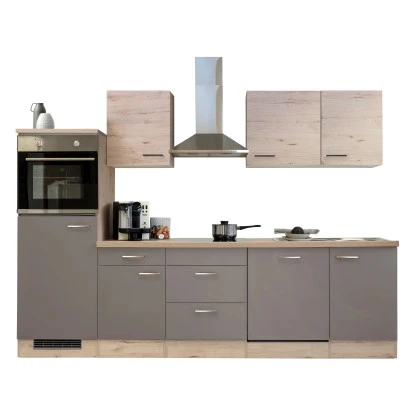 Die Fronten in Quarz-Cubanit und San Remo Eiche hell sorgen für ein warmes, einladendes Ambiente. Silberfarbene Metallgriffe runden das Gesamtbild harmonisch ab. Die hochwertigen Kunststofffronten bestechen nicht nur durch ihre Optik, sondern sind auch pflegeleicht.