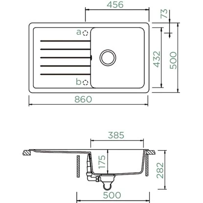 Bei der Spüle handelt sich um ein eckiges Einzelbecken mit einer Abtropffläche auf der linken Seite. Es wird ein Arbeitsplattenausschnitt von (B x L) 84 cm x 48 cm benötigt. Das Becken hat eine Länge von 38,5 cm und eine Breite von 43,2 cm.