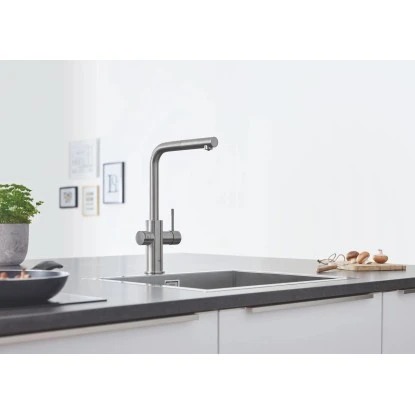 Das Grohe Blue Home L-Auslauf Starter Kit besteht aus einer Grohe Blue Home Mono Einhand-Spültischbatterie mit Filterfunktion, einem Grohe Blue Home Kühler, einem Grohe Blue Filter S-Size und einer Grohe Blue 425 g CO²-Kapazität. Diese Armatur verfügt über Drucktasten für drei gefilterte und gekühlte Tafelwasserarten (Still, Medium, Sprudelnd). Der Rohrauslauf ist bis zu 360° schwenkbar und herausziehbar. Die Wasserführung ist getrennt und somit für gefiltertes und ungefiltertes Wasser geeignet.