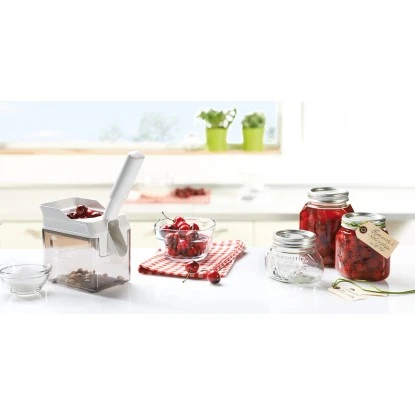 Der Küchenhelfer entkernt frische und konservierte Kirschen schnell und einfach. Dabei rollen sie alleine und nacheinander in den Einfüllbehälter. In nur einer Stunde lassen sich 12 kg frische Kirschen oder der Inhalt von 12 Einmachgläsern entkernen. Möglich macht es die besondere Form des Cherrymat. Die Kirschen werden in eine Einfüllschale gefüllt und rollen nacheinander in den Entkerntrichter. Dort werden sie vom heruntergedrückten Edelstahlmesser sauber in Kerne und Fruchtfleisch getrennt, ohne zerquetscht zu werden.