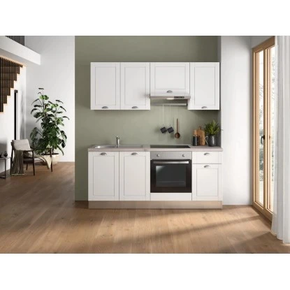 Ob erste Wohnung, Single-Haushalt oder Ferienwohnung die 195 cm Breite Küchenzeile Anastasia überzeugt durch ihr klassisches Landhaus Design, die vielfältigen Funktionen und die bereits integrierten Elektrogeräte. Jede Art von Mahlzeiten lassen sich schnell dank dem Einbauherd-Set mit Backofen, Glaskeramikkochfeld und Wandhaube zubereiten. Die Schränke werden vormontiert geliefert, dadurch sparen Sie Zeit und zusätzliche Kosten beim Aufbau. Die hochwertigen und pflegeleichten MDF-Fronten und die stabile Bauweise der Schrankkörper garantieren Ihnen lange Freude an Ihrer Küche.