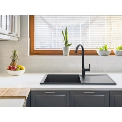 Gefertigt ist die Einbauspüle aus einem widerstandsfähigen Granitverbundstoff in der Farbe Graphit. Zu den Materialeigenschaften gehören eine hohe Robustheit sowie Stoßfestigkeit. Gleichzeitig ist es hitzebeständig und pflegeleicht. Es ist wichtig, dass bei der Reinigung von Granitspülen keine chemischen Reinigungsmittel mit ätzenden Eigenschaften, z. B. Chlor, oder Milch mit scharfen abrasiven Bestandteilen zu verwenden. Für die perfekte Pflege und Reinigung der Spüle empfehlen wir den Reiniger und Pflegemittel von Miló, welche separat erhältlich sind.