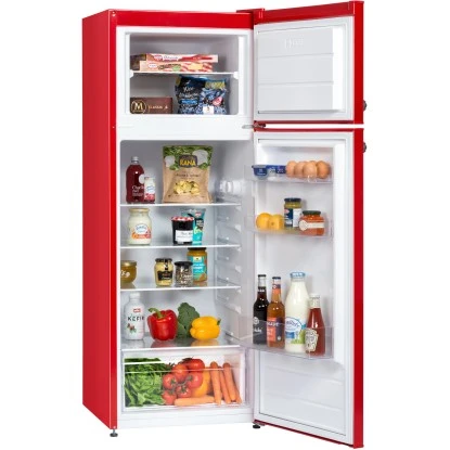 Die Respekta Kühl-/Gefrierkombination KS144 Vintage VC in Rot überzeugt vor allem durch ihre Funktionalität. Das Gerät besitzt neben einem Kühlinhalt von 171 Litern einen Nutzinhalt des Gefrierfachs von 42 Litern. Somit finden nicht nur Ihre frischen Lebensmittel und Getränke genügend Platz, sondern auch Vorräte, die tiefgefroren sind. Zusätzlicher Komfort wird durch verstellbare Füße, einen wechselseitigen Türanschlag, LED-Beleuchtung im Kühlraum oder auch dem automatischen Abtauverfahren im Kühlteil erreicht.