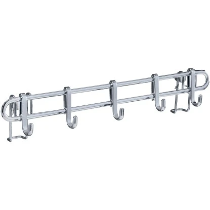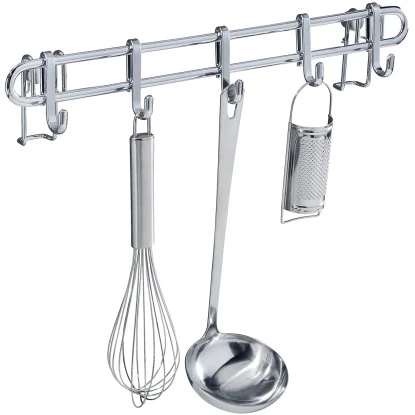 Die elegante Haken-Leiste der Style-Serie von Wenko aus glänzendem, verchromtem Metall lässt sich über der Arbeitsfläche in der Küche anbringen, so dass alle Kochutensilien schnell griffbereit sind. Die funktionale Aufhängung schafft zusätzlichen Raum in der Küche und bietet eine geordnete Übersicht beim Kochen oder Backen. Einfach die Küchenhelfer wie Schneebesen, Suppenkelle, Pfannenwender, Schere, etc. an den fünf beiliegenden Haken aufhängen, schon schaffen Sie Ordnung und zusätzlichen Stauraum auf 40 cm Breite. Die Küchen-Reling lässt sich genau dort befestigen, wo sie gerade benötigt wird. Im Lieferumfang sind Schrauben und Dübel für die Wandmontage enthalten.